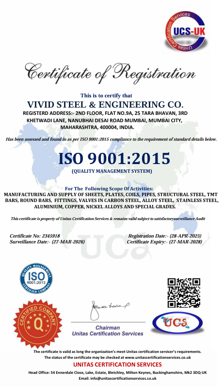 Vivid Steel & Engineering has grown to become one of the most prominent importer and stockiest of High Nickel Alloys like Hastelloy, Inconel, Monel, Duplex & Super Duplex, Stainless Steel, Carbon Steel and Structural Steel in India. We carry a full range of Sheets, Plates, Pipes, Tubes, Bars, Rods, Angles, Coils, Fittings & Flanges.